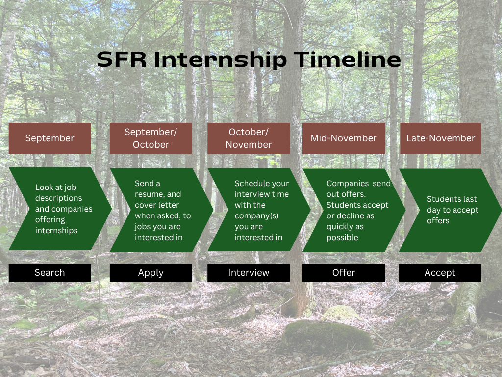 Drawing upon its deep network of faculty, alumni, and forestry professionals, the School of Forest Resources (SFR) connects students with a wide variety of internships and summer employment opportunities across the state and country. The program’s strong ties with industry leaders further enhance these connections, offering students applied, hands-on experience with esteemed forestry employers. These focused field experiences guide students towards the path that fits them best, whether that be within the private sector, non-profit organizations, or federal work. Found below is a timeline, itinerary, and more information about how to apply for internships and the companies that work directly with SFR.